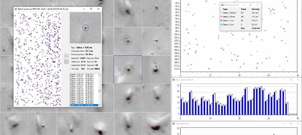 Shows you all defects of an entire roll, including important data like defect types, size, density.
