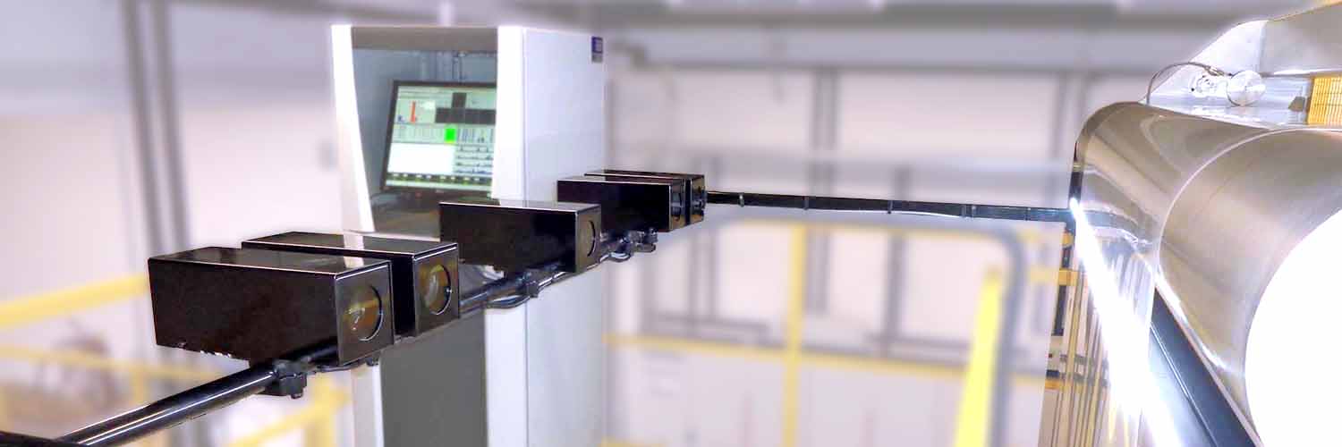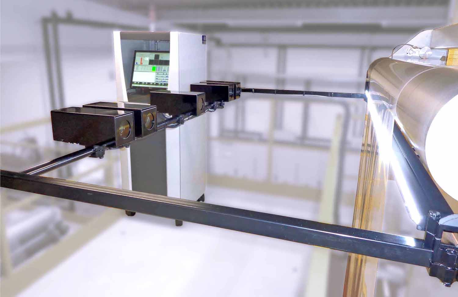 Advanced CMOS and TDI line scan cameras capture high resolution images of the moving web.
