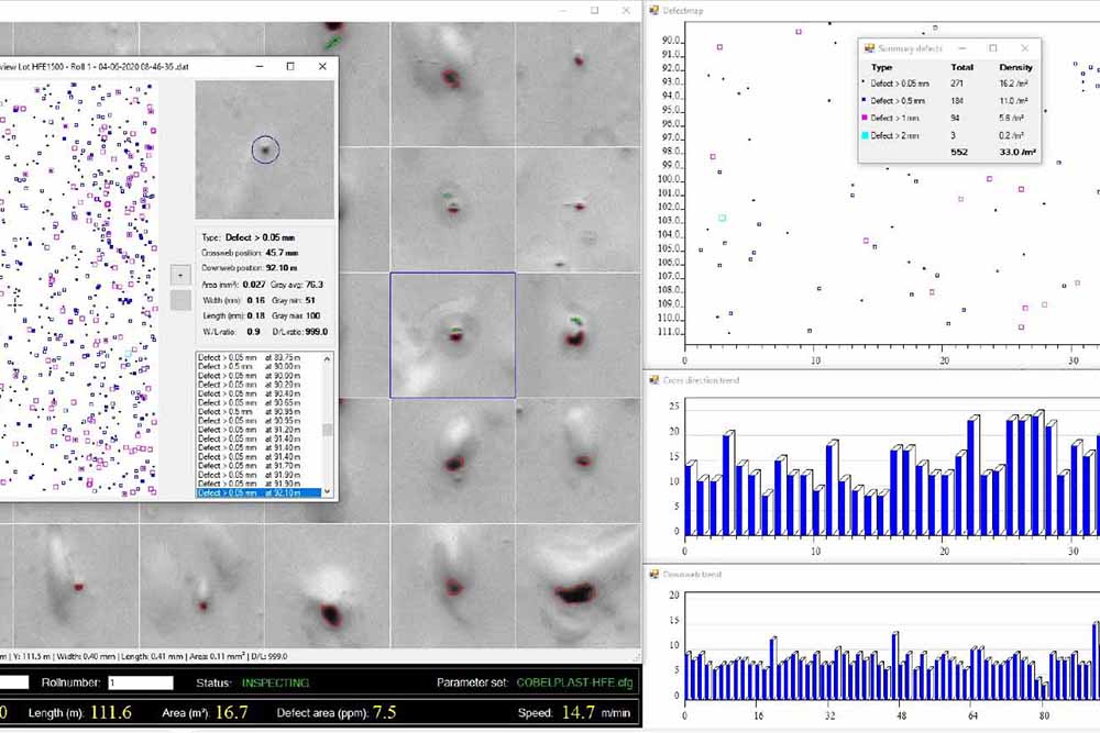 The system detects defects of all types: gels, holes, bubbles, contaminants, stains, coating inconsistencies, streaks – each type of defect can be categorised and distinguished.